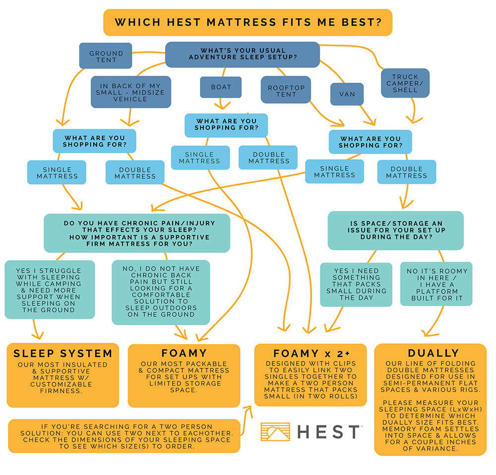 Roof top tents are a more durable and plush alternative to ground tents. See which HEST mattress size will best fit in either your soft shell or hard shell RTT below.